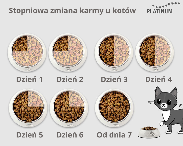 Uwaga, psiarze! Żywienia przejściowego nie stosuj u swojego psa. W przypadku tych czworonogów zalecamy natychmiastową zmianę karmy na PLATINUM bez fazy wprowadzającej nową karmę. Pies nie jest tak ostrożny jak kot i gdy wzrośnie jego głód, zacznie spożywać nowe jedzenie.